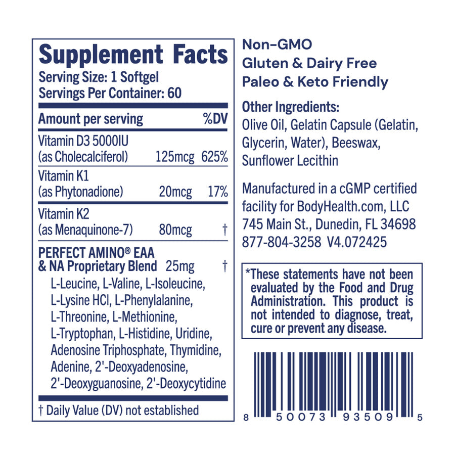 Each serving delivers 125 mcg Vitamin D3 (5000 IU), 20 mcg Vitamin K1, and 80 mcg Vitamin K2 (MK7) plus PerfectAmino® EAAs—supporting strong bones, immune function, and cardiovascular elasticity.*