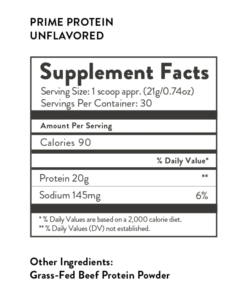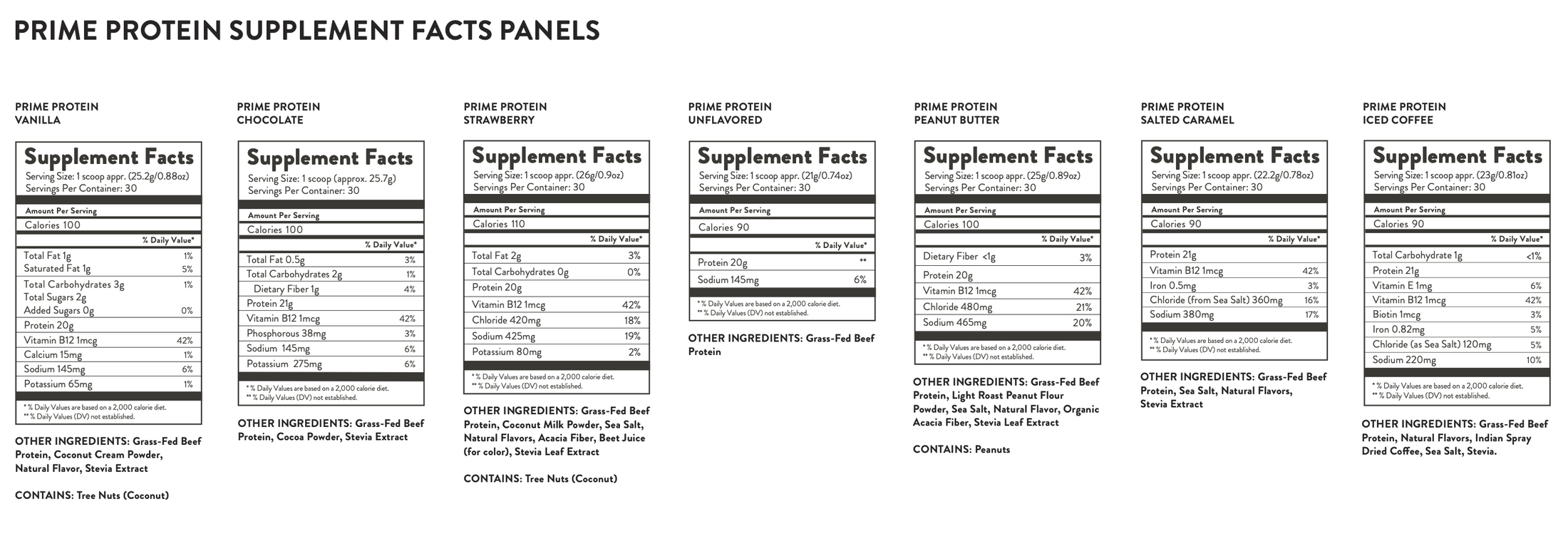 Every serving of Prime Protein contains 4 oz of grass-fed beef. That’s 21g of protein and absolutely no sugars. We use stevia to sweeten our flavored blends but Unflavored Prime is stevia-free.