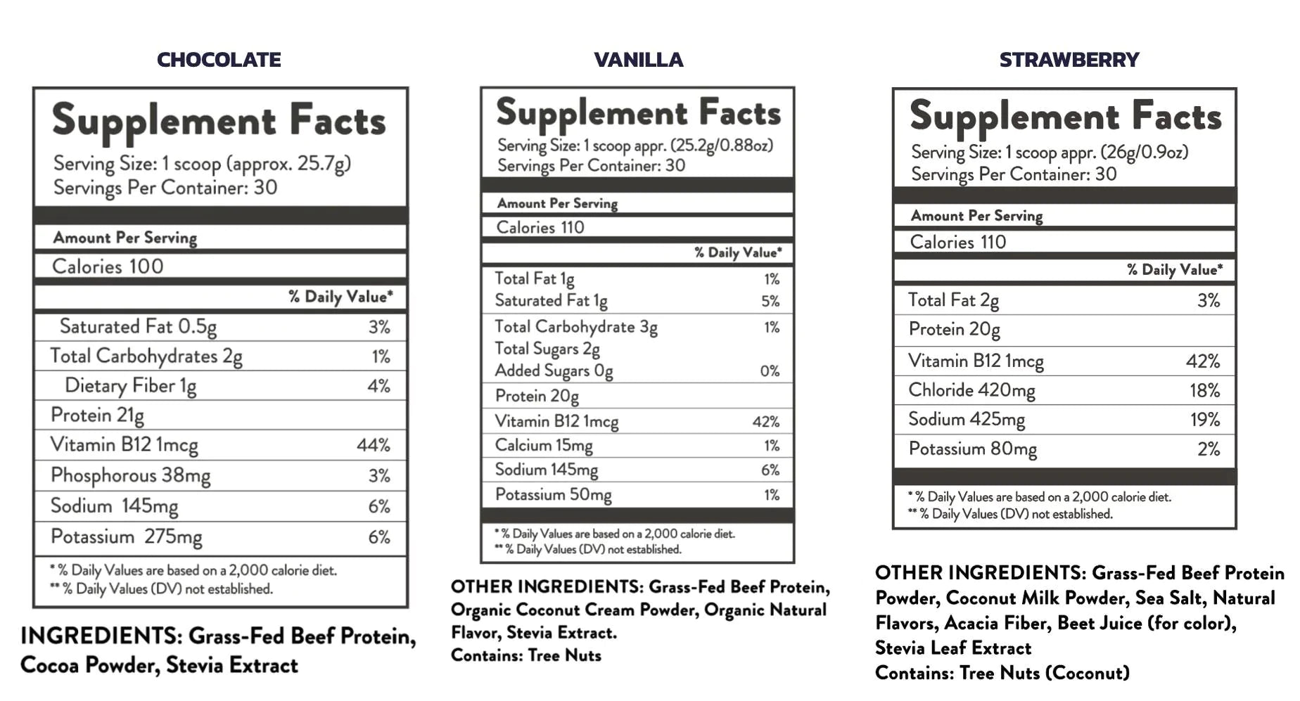 Other Ingredients: Grass fed beef protein powder, coconut milk powder, sea salt, natural flavours, acacia fiber, beet juice (for colour), stevia leaf extract